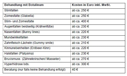 Die Kosten hängen von der Größe des zu behandelnden Bereichs und der Anzahl der benötigten Botulinum-Einheiten ab und werden nach der Gebührenordnung für Ärzte (GOÄ) berechnet. Die folgenden Preise sind daher nur Richtwerte.
